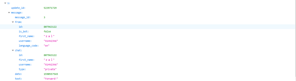 Dari message_id = 3 berisikan pesan yang telah saya kirim kepada bot dengan nilai ‘Forward!‘.