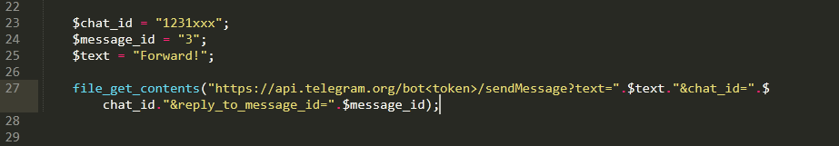 $chat_id = "1231xxx";$message_id = "3";$text = "Forward!";file_get_contents("https://api.telegram.org/bot<token>/sendMessage?text=".$text."&chat_id=".$chat_id."&reply_to_message_id=".$message_id);